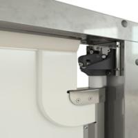 Для работы двери используется специальная V-образная гравитационная петля собственного производства. Петля изготовлена из нержавеющей стали AISI304, пригодной для использования в пищевой промышленности и в помещениях с повыщенными требованиями к гигиене.